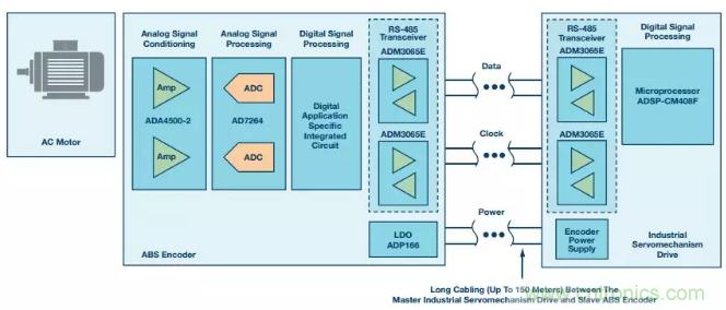 圖1顯示了一個電機控製信號鏈,其利用RS-485收發器和微處理器連接絕對編碼器(ABS編碼器)從機和工業伺服驅動器主機,以實現對交流電機的閉環控製。