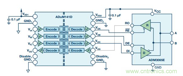 RS-485信號傳輸是平衡的差分式傳輸,本身便能抗幹擾。係統噪聲均等地耦合到RS-485雙絞線電纜中的每條導線。一個信號的發射與另一個信號相反,耦合到RS-485總線的電磁場彼此抵消。這降低了係統的電磁幹擾(EMI)。此外,ADM3065E增強的2.1 V驅動強度支持在通信中實現更高的信噪比(SNR)。給ADM3065E增加信號隔離可利用ADuM141D 輕鬆實現。