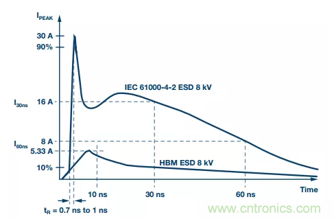 圖3:IEC 61000-4-2 ESD波形(8 kV)與HBM ESD波形(8 kV)的對比