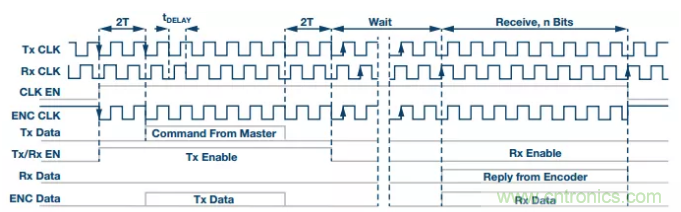 來自處理器的時鍾信號是連續的,而EnDat協議規定,時鍾隻能在通信期間施加於編碼器。在所有其他時候,時鍾線路必須保持高電平。為此,處理器產生一個時鍾使能信號CLK EN,其被送至ADM3065E數據使能引腳。恰好兩個時鍾周期(2T)之後,主機開始在Tx DATA上發出命令。命令有6位長,隨後是兩個0位。為了控製收發器的數據方向,處理器在傳輸時將Tx/Rx EN位置1。