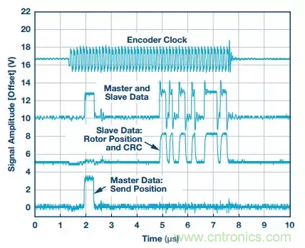 圖6顯示了EnDat係統的測試結果。測試使用的時鍾頻率為8 MHz,延遲補償通過接收時鍾相移實現。底部信號是來自EnDat主機的命令。此處顯示的命令為“發送位置”,其前麵是兩個0,接著是六個1,最後又是兩個0。該命令總共有10位。編碼器的響應是從頂部起的第三個信號。合並數據線是從頂部起的第二個信號。最後,頂部信號是施加於編碼器的時鍾。