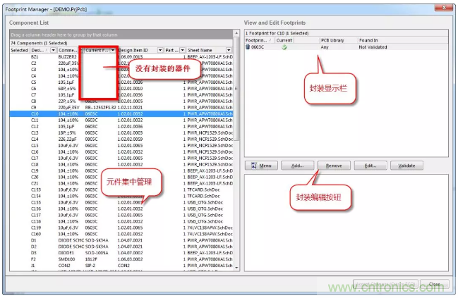 3、封裝庫管理器可以對一個或多個器件進行封裝,進行添加、刪除、編輯等操作,同時可以通過Comment值篩選,局部或全局更改(或添加)同類型器件封裝名,如圖1-3所示。