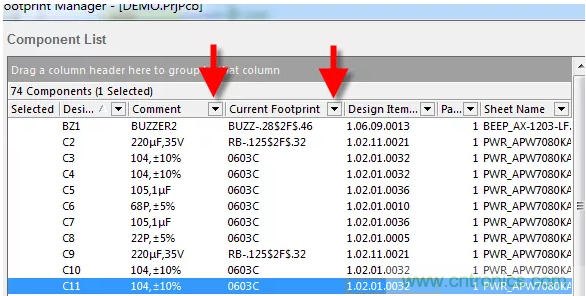 2、如圖1-2可見,原理圖中涉及到的元器件都在“Component List”裏麵進行了顯示,點擊“Current Footprint”,可ke對dui同tong類lei型xing的de封feng裝zhuang進jin行xing集ji中zhong排pai序xu,方fang便bian我wo們men設she計ji者zhe按an照zhao封feng裝zhuang庫ku類lei去qu檢jian查zha封feng裝zhuang的de完wan整zheng性xing,若ruo某mou個ge器qi件jian沒mei有you添tian加jia封feng裝zhuang,會hui優you先xian在zai前qian排pai顯xian示shi處chu理li。
