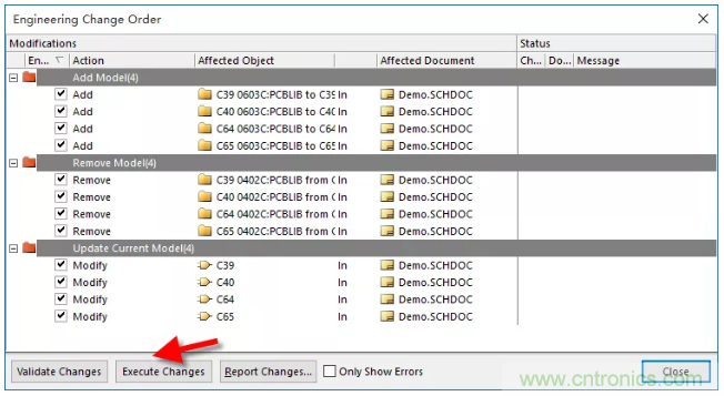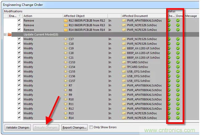 4、對封裝進行完編輯或添加等操作之後,執行右下角的“Accept Changes(Create ECO)”命令,對更新內容點擊“Execute Changes”更新到原理圖當中,如圖1-4。