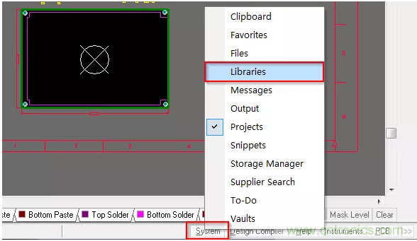 1、首先,指定庫路徑前,要刪除PCB中已關聯的係統庫,打開PCB界麵,單擊右下角“System”菜單中的“Libraries”按鈕,可調出如圖1-5所示庫編輯頁麵。