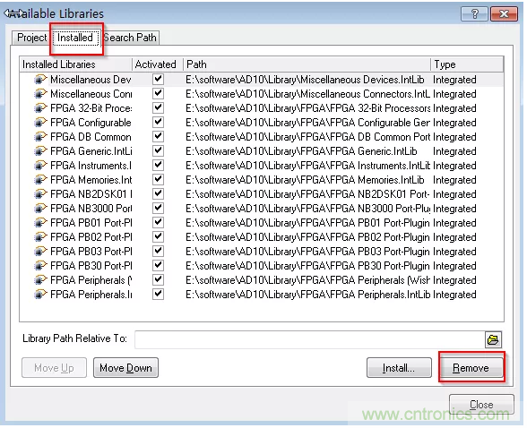 2、如圖1-6所示,單擊“Libraries”按鈕,進入庫的安裝編輯界麵,在圖中選擇“Installed”下的所有封裝庫,再單擊“Remove”按鈕,完成係統關聯庫的移除操作。