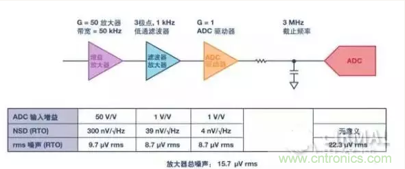 其次,即使在隻有一個ADC和一個驅動放大器的簡單情況下,權衡噪聲並確定其對係統的影響仍是有利的。通過具體數值可以更清楚地了解其中的理由。