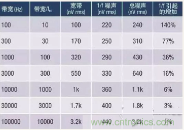 表1:1/f 噪聲影響與電路帶寬的關係示例