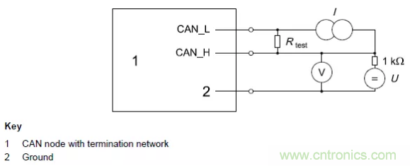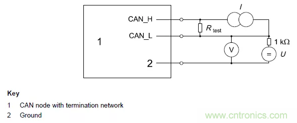 一個CAN節點檢測到顯性位輸入限值的測量方法見圖2,此節點應該循環發送數據。其中I的值是指可以產生使節點在隱性狀態下檢測到顯性位的最小差分輸入電壓的電流值。電壓源U的電壓為: