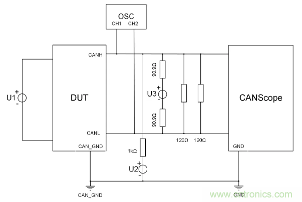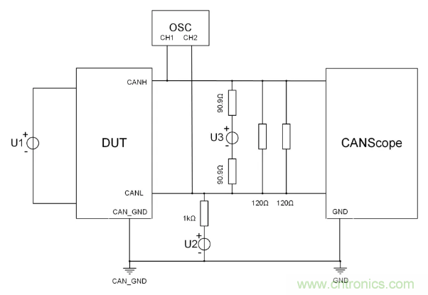 斷開電壓源U3,調節電壓源U2,逐步將共模電壓調到6.5V或-2V,在此期間DUT應能正常發送報文;