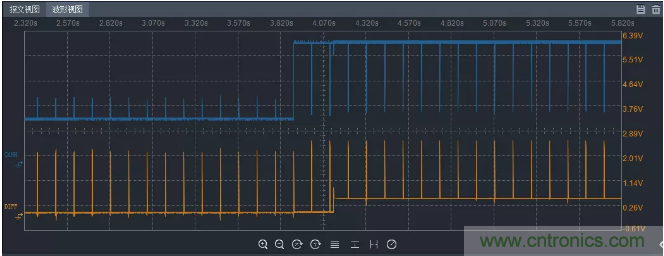 其加入6.5V共模電壓及差分電平為0.5V後的波形細節如圖7所示,當總線處於空閑狀態時,CANH和CANL的電壓由正常被拉高到共模電壓附近,當總線處於驅動狀態時,CANH和CANL的電壓近似顯、隱性狀態時的正常電壓,在驅動狀態過程中,電平轉換時由於一直受到共模電壓的影響,隱性電平或顯性電平會有些坡度。