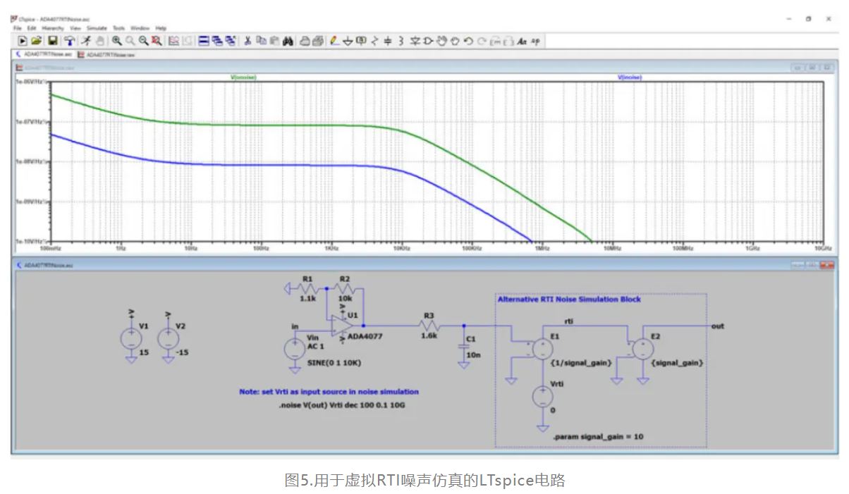 LTspice的多功能性和準確性使其對噪聲仿真非常有用。輸出節點和輸入源在噪聲仿真命令中指定,輸出噪聲(RTO)是查看分析結果的默認方式。LTspice還會根據RTI的傳統定義計算參考到指定輸入源的輸入噪聲,但如圖4所示,對傳統RTI噪聲進行積分無法提供有意義的結果。圖5顯示了如何在LTspice的輸出中添加一級,以便仿真器返回替代的虛擬RTI噪聲。運行仿真後,在選定圖形的情況下,從Plot Settings—Add Trace將輸入噪聲添加到圖形中,然後選擇V(inoise)。這會將輸入噪聲添加到圖形中。曲線形狀與輸出噪聲相匹配,表明整個電路的頻率響應都得到了考慮。在按住ctrl鍵的同時左鍵單擊圖形中標題為"V(inoise)"的曲線,以對總RTI噪聲進行積分。