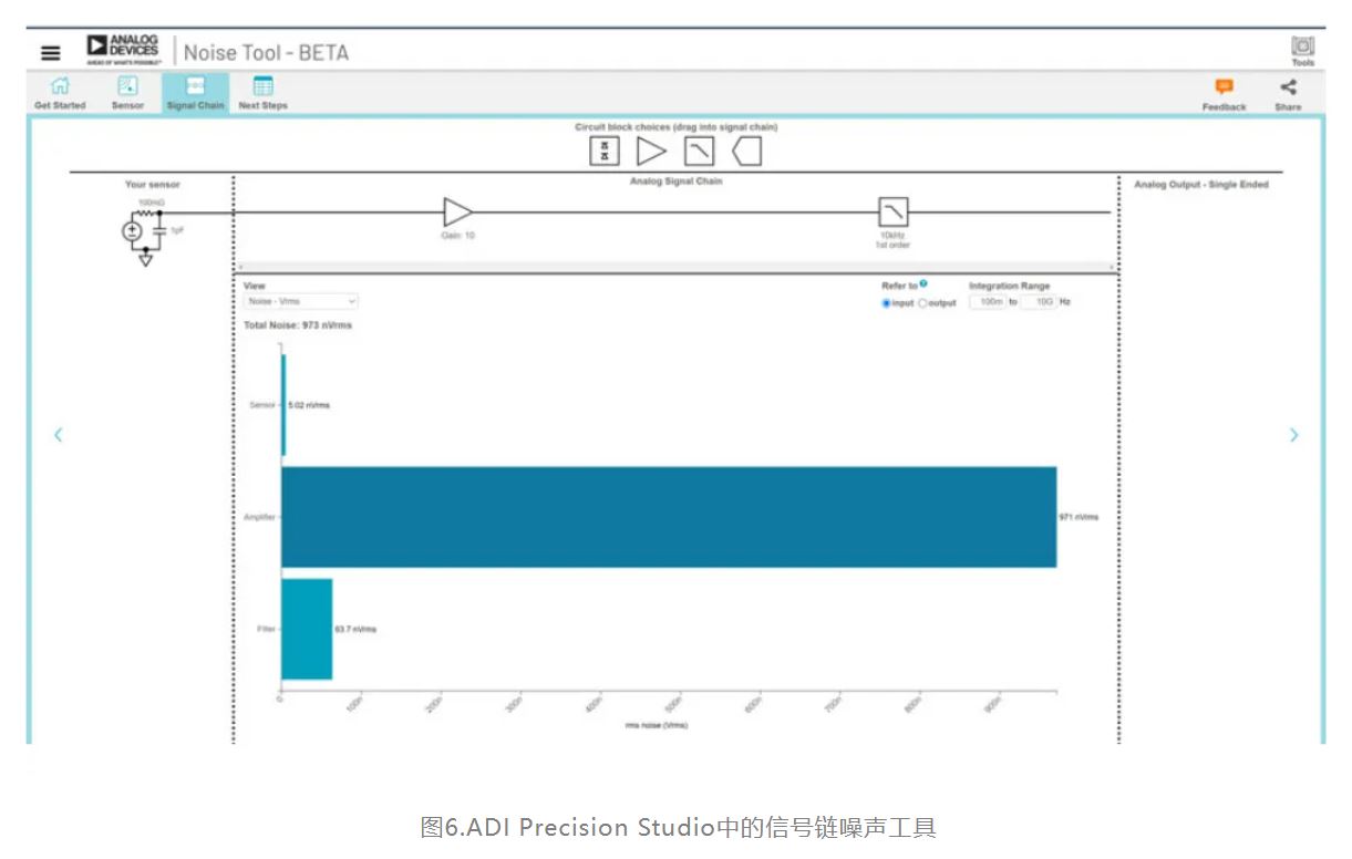 信號鏈噪聲工具 是ADI Precision Studio web工具套件的一部分,用於執行信號鏈級的噪聲計算,包括總噪聲的積分和虛擬RTI噪聲計算。從傳感器開始構建信號鏈,或從示例開始,然後利用信號鏈噪聲工具確定從傳感器到ADC的(de)整(zheng)個(ge)信(xin)號(hao)鏈(lian)的(de)總(zong)噪(zao)聲(sheng)和(he)交(jiao)流(liu)性(xing)能(neng)。信(xin)號(hao)鏈(lian)噪(zao)聲(sheng)工(gong)具(ju)中(zhong)的(de)仿(fang)真(zhen)模(mo)型(xing)使(shi)用(yong)數(shu)據(ju)手(shou)冊(ce)中(zhong)的(de)完(wan)整(zheng)測(ce)量(liang)噪(zao)聲(sheng)曲(qu)線(xian)來(lai)提(ti)供(gong)實(shi)驗(yan)室(shi)精(jing)度(du)的(de)結(jie)果(guo)。此(ci)類(lei)工(gong)具(ju)的(de)主(zhu)要(yao)優(you)點(dian)之(zhi)一(yi)是(shi)能(neng)夠(gou)加(jia)快(kuai)設(she)計(ji)過(guo)程(cheng)。該(gai)工(gong)具(ju)可(ke)即(ji)時(shi)仿(fang)真(zhen)電(dian)路(lu)變(bian)化(hua)對(dui)整(zheng)體(ti)噪(zao)聲(sheng)性(xing)能(neng)的(de)影(ying)響(xiang),從(cong)而(er)加(jia)快(kuai)設(she)計(ji)迭(die)代(dai)速(su)度(du)。完(wan)成(cheng)後(hou)的(de)信(xin)號(hao)鏈(lian)可(ke)導(dao)出(chu)到(dao)LTspice進行定製仿真。