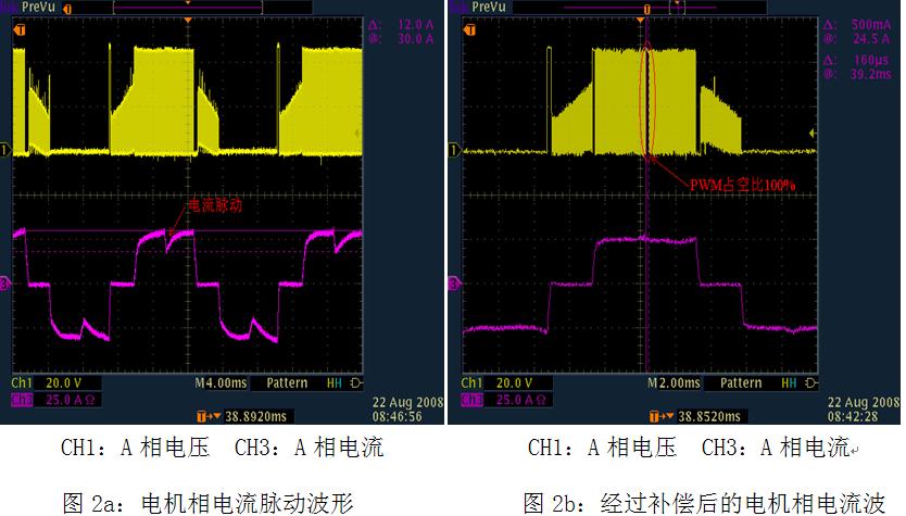 圖2b是采用XC866控製芯片的係統在經過上述方法優化後測得的換相電流波形,由圖2bkeyikanchu,huanxiangshidedianliumaidongjibenxiaochu,dianjidexiangdianliujibenjiejinfangbo。yonglezhetaokongzhixitongdediandongche,qibujiasuyijiyunxingshidedianjizhendongyijibenxiaochu,shixianlechaojingyinkongzhiqidesheji。