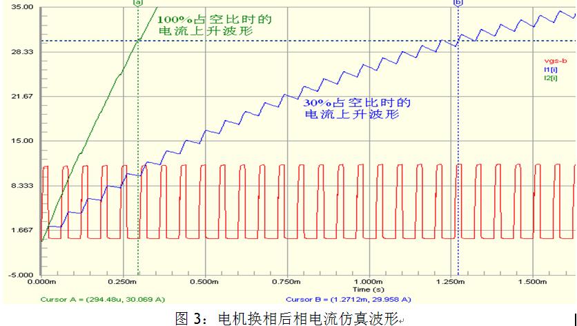 由於在低速大負載運行時,電機的旋轉反電勢很小,為了使電機的相電流不超過允許的最大值,PWM占空比通常比較小,這使得換相後新的相繞組電流上升緩慢。圖3中是電機換相時的電流仿真波形。電機兩相之間的電感為Lm=0.4mH,內阻Rm=0.28歐姆(實際電機的參數)。采用AOS(萬代半導體)生產的AOT460 MOSFET進行仿真。MOSFET的PSPICE模型采用level3等級。由圖3中可以看出,如果PWM占空比為30%,則電流由零上升到30A需要約1.3ms。這與圖2a中實測的波形相仿。為了使換相後電流迅速上升,我們可以使換相後PWM占空比為100%來對電流進行補償,直到電流上升到換相前的電流值,這樣可以使換相電流的波動盡可能的小,時間盡可能地短。由仿真波形中I2可以看出,電流上升到30A的時間小於300us。