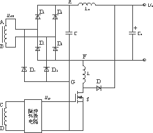二次為橋式整流電路如圖4所示。圖中D1,D2,D3,D4為主整流管;D11及D12為毛刺吸收電路專用二極管。Lo與Co為主整流電路中的電感和電容;C為毛刺能量儲存電容。L,S,D組成毛刺能量轉換釋放電路。主變壓器中繞組CD和脈衝轉換電路一起形成S的開關控製脈衝ugs,與繞組AB形成固定的相位關係。繞組AB的電壓uAB波形與S上的驅動脈衝波形示於圖5。