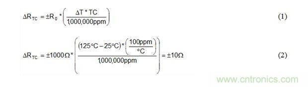 公式1和公式2是溫度從25°C到125°C變化時,如何使用電阻器TC規範計算1kΩ、±100ppm/°C電阻器阻值ΔRTC變化的實例。