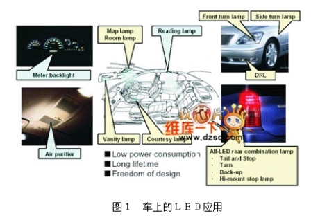 LED已經廣泛的應用於車內的相關照明或指示用光源,由圖1可知,從車內的儀表板燈、車頂燈、化妝燈、迎賓燈等,到車外的尾燈、前後轉向燈、倒車燈、第三刹車燈等都可見到LED的相關應用。