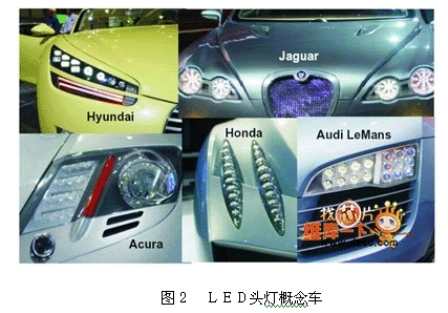 從LED的應用曆史來看,早在1992年時已經有LED應用於第三刹車燈上的先例;而在2000年時則進一步的應用於尾燈、轉向燈與刹車燈;到了2002年Audi A8率先將LED光源置於前置燈具內作為日行燈,開啟了設計師與工程師們在前置燈具的想象空間。在之後的許多國際車展上都可以看到LED作為前照燈源的概念車,如圖2所示。