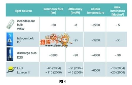 目前使用於車上的燈源可區分為白熾燈泡、鹵素燈泡、氣體放電式燈泡與LED光源,其比較如圖4所示。