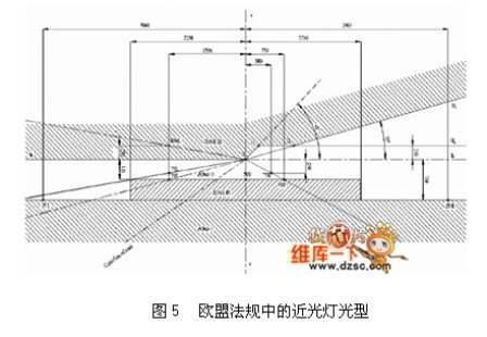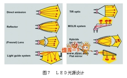 光學設計時先考慮法規需求,討論視角與強度關係,以近燈為例須針對其特殊的15度揚角設計,如圖5所示。在傳統的燈具設計上由先期的利用反射罩配合透鏡刻ke紋wen作zuo角jiao度du與yu強qiang度du的de控kong製zhi,演yan變bian成cheng為wei利li用yong反fan射she罩zhao直zhi接jie控kong製zhi強qiang度du角jiao度du,也ye發fa展zhan出chu利li用yong成cheng像xiang方fang式shi的de魚yu眼yan透tou鏡jing設she計ji法fa。不bu論lun何he種zhong的de設she計ji方fang式shi都dou須xu先xian考kao慮lv選xuan用yong光guang源yuan的de特te性xing,特te別bie是shi角jiao度du與yu強qiang度du的de光guang型xing輸shu出chu(Beam pattern),對傳統的光源而言,大多為柱狀光源,可產生類似蝴蝶外型的光型輸出,進而發展出來與之搭配的透鏡、反射罩、擋板、透鏡等光學組件。而利用LED作為光源設計燈具時,需重新考慮其光學特性由傳統的柱狀光源變為平麵光源(不同的封裝設計有不同的光型輸出),進而搭配外部的光學組件而產生不同組合以應用於不同產品,依照德國車燈大廠HELLA的設計分類,可將光源分為八大類,如圖6 所示。LED目前的單位麵積發光量尚不及鹵素燈泡與放電式燈泡,想得到相同的流明輸出,LED需xu要yao較jiao大da的de封feng裝zhuang麵mian積ji。隨sui著zhe光guang源yuan輸shu出chu麵mian積ji的de增zeng加jia,光guang學xue設she計ji的de難nan度du也ye隨sui之zhi提ti升sheng,所suo以yi在zai現xian有you的de概gai念nian車che上shang,都dou以yi模mo塊kuai化hua光guang學xue設she計ji取qu代dai既ji有you的de單dan一yi燈deng室shi設she計ji,利li用yong多duo組zu燈deng源yuan達da到dao傳chuan統tong燈deng具ju的de照zhao明ming水shui平ping,除chu了le降jiang低di光guang學xue設she計ji的de難nan度du,也ye增zeng加jia車che體ti造zao型xing的de設she計ji感gan。