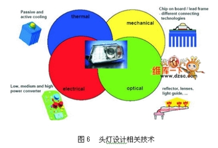 開(kai)始(shi)著(zhe)手(shou)設(she)計(ji)頭(tou)燈(deng)之(zhi)前(qian),應(ying)先(xian)考(kao)慮(lv)法(fa)規(gui)上(shang)的(de)相(xiang)關(guan)規(gui)定(ding),包(bao)括(kuo)光(guang)型(xing)亮(liang)度(du),環(huan)境(jing)測(ce)試(shi),亮(liang)度(du)衰(shuai)減(jian)等(deng)需(xu)求(qiu),進(jin)一(yi)步(bu)考(kao)慮(lv)相(xiang)關(guan)光(guang)學(xue)設(she)計(ji),機(ji)構(gou)設(she)計(ji),耐(nai)熱(re)設(she)計(ji)與(yu)電(dian)控(kong)設(she)計(ji)等(deng)細(xi)節(jie),對(dui)於(yu)LED而言,光學設計的考慮除了反射罩設計之外,尚需考慮LED本身的出光光型,不同的封裝型態將產生不同的光型輸出,進一步將影響反射罩或成像透競的要求,與傳統頭燈設計需考慮不同燈泡(H1、H4、H7、H11等)leisi。zaichuantongdetoudengshejishang,dengpaobenshendeguangzishifanglaizijiarewudengsi,buhuiyinzishenfachuderehuolaiziyinqingshidegaoweneryingxiangliangdushuchu,sanrezhongdianluozaizhenggetoudengqiangtidejunwenshejierfeidengpaodesanre,danzaitoudengcailiaodexuanzeshangzexukaolvshifoukechengshoulaizidengpaodegaowen(頭燈腔體約承受100℃的溫度,霧燈腔內溫度可高至300℃),所以在此選用的材料一般都以耐熱材為主;然而對於LED而言,其光子釋放來自於PN接口的能階跳動,與溫度呈現負相關,溫度越高則光源輸出越弱,因此散熱成為LED作為光源設計的重要課題。