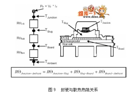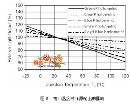 散熱設計是LED光源區別於傳統光源的課題之一。傳統燈具產生的熱遠高於LED,但傳統燈具不會因為高溫而降低其光源輸出能力,但LED的光輸出卻會隨著本身接口(Junction, PN接口)溫度的升高而下降,如圖8所示。而其產生的熱如何散除到外界環境與其封裝結構材料息息相關,牽涉到使用的散熱材料與相關外型,關係如圖9所示,其中熱阻的概念,代表輸入W功率時,需要提高多少K溫度才足以散熱。以現有的封裝技術最高可允許LED操作在185℃(Lumiled K2),但一般因為封裝膠材的關係,可允許的操作溫度約在125℃,除了考慮光源輸出效率之外,亦考慮封裝膠材的變質(樹脂類材料在高溫有老化現象)。
