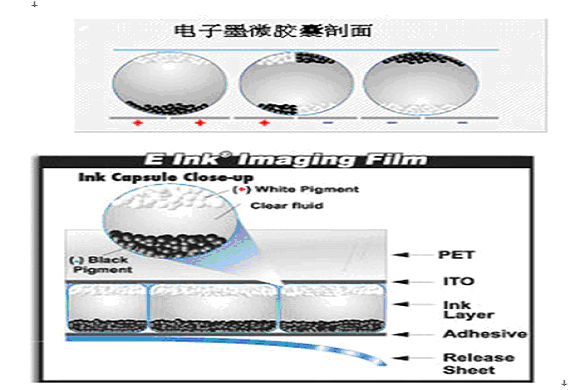 E-Ink的電子紙由電子墨水及兩片基板所組成:第一部分是電子墨水,有時被稱為“前基板(front plane)”;二是使電子墨水生成文本和圖像所需要的電子設備組合,包括控製部分和顯示部分,被稱為“背基板(backplane)”。背(bei)基(ji)板(ban)上(shang)麵(mian)塗(tu)有(you)由(you)無(wu)數(shu)微(wei)小(xiao)的(de)透(tou)明(ming)顆(ke)粒(li)組(zu)成(cheng)的(de)電(dian)子(zi)墨(mo)水(shui),顆(ke)粒(li)直(zhi)徑(jing)隻(zhi)有(you)人(ren)的(de)頭(tou)發(fa)絲(si)的(de)一(yi)半(ban)大(da)小(xiao)。電(dian)子(zi)墨(mo)水(shui)是(shi)一(yi)種(zhong)加(jia)工(gong)成(cheng)薄(bo)膜(mo)狀(zhuang)的(de)專(zhuan)用(yong)材(cai)料(liao),與(yu)電(dian)子(zi)顯(xian)示(shi)設(she)備(bei)結(jie)合(he)在(zai)一(yi)起(qi)使(shi)用(yong),是(shi)化(hua)學(xue)、物wu理li學xue和he電dian子zi技ji術shu的de綜zong合he應ying用yong。電dian子zi墨mo水shui由you數shu百bai萬wan個ge尺chi寸cun極ji小xiao的de微wei膠jiao囊nang構gou成cheng,直zhi徑jing與yu頭tou發fa絲si相xiang當dang。每mei一yi個ge微wei膠jiao囊nang中zhong含han有you帶dai正zheng電dian荷he的de白bai色se粒li子zi和he帶dai負fu電dian荷he的de黑hei色se粒li子zi,它ta們men懸xuan浮fu在zai清qing潔jie的de液ye體ti中zhong。 如圖1所示,電子墨水薄膜的頂部是一層透明材料,作為電極端使用;底(di)部(bu)是(shi)電(dian)子(zi)墨(mo)水(shui)的(de)另(ling)一(yi)個(ge)電(dian)極(ji),微(wei)膠(jiao)囊(nang)夾(jia)在(zai)這(zhe)兩(liang)個(ge)電(dian)極(ji)間(jian)。微(wei)膠(jiao)囊(nang)受(shou)負(fu)電(dian)場(chang)作(zuo)用(yong)時(shi),白(bai)色(se)顆(ke)粒(li)帶(dai)正(zheng)電(dian)荷(he)而(er)移(yi)動(dong)到(dao)微(wei)膠(jiao)囊(nang)頂(ding)部(bu),相(xiang)應(ying)位(wei)置(zhi)顯(xian)示(shi)為(wei)白(bai)色(se);heisekeliyouyudaifudianheerzaidianchanglizuoyongxiadaodaweijiaonangdibu,shiyongzhebunengkandaoheise。ruguodianchangdezuoyongfangxiangxiangfan,zexianshixiaoguoyexiangfan,jiheisexianshi,baiseyinzang。kejian,zhiyaogaibiandianchangzuoyongfangxiangjiunengzaixianshiheisehebaisejianqiehuan,baisebuweiduiyingyuzhizhangdeweizhemobufen,erheisezeduiyingzhezhizhangshangdeyinshuatuwenbufen。