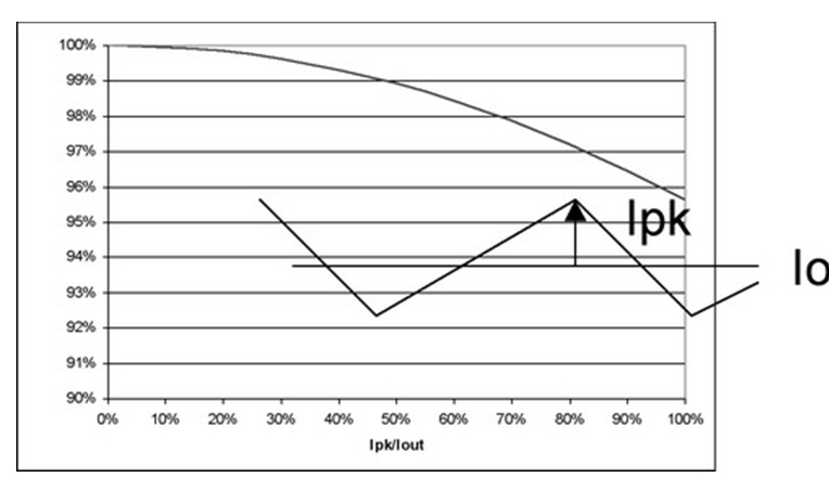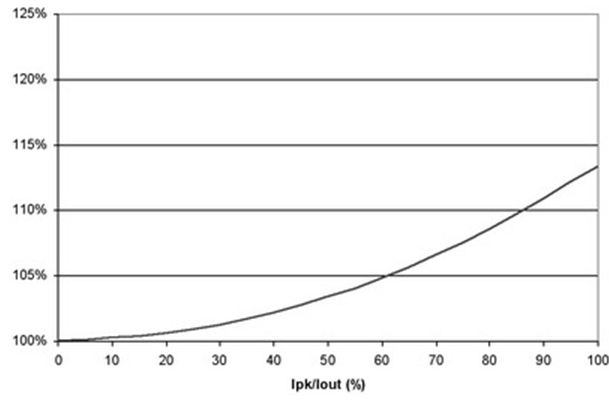 圖4 也闡明了即使在紋波電流較大的時候,對功耗也沒有重大影響。例如,50%的紋波電流僅增加不足5%的功率損耗。當大大超過此水平時,需要減小電源的DC電流以保持結溫不變,從而維持半導體的使用壽命。經驗法則顯示,結溫每降低10%,半(ban)導(dao)體(ti)使(shi)用(yong)壽(shou)命(ming)就(jiu)會(hui)延(yan)長(chang)兩(liang)倍(bei)。並(bing)且(qie),許(xu)多(duo)設(she)計(ji)都(dou)傾(qing)向(xiang)於(yu)更(geng)小(xiao)的(de)紋(wen)波(bo)電(dian)流(liu),這(zhe)是(shi)因(yin)為(wei)電(dian)感(gan)器(qi)的(de)限(xian)製(zhi)。絕(jue)大(da)多(duo)數(shu)電(dian)感(gan)的(de)設(she)計(ji)處(chu)理(li)能(neng)力(li)小(xiao)於(yu)20%的Ipk/Iout紋波電流比率。