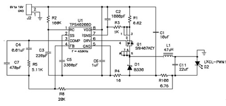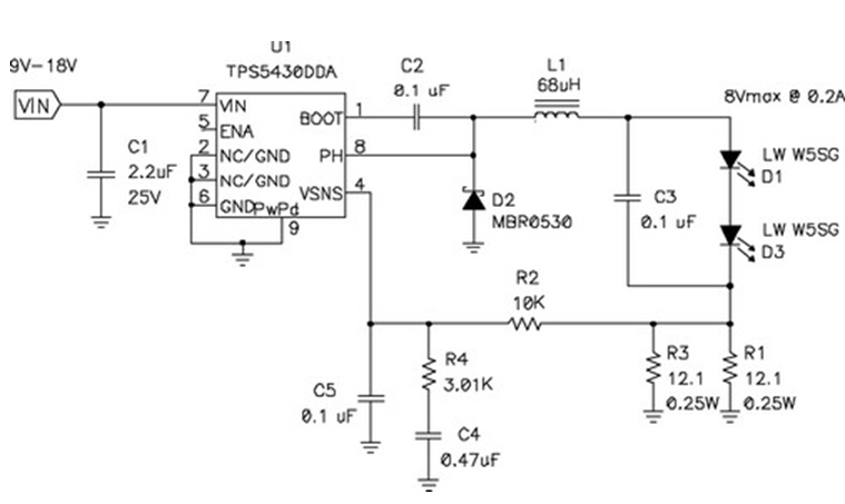 在輸出電壓始終小於輸入電壓的情況下,應使用降壓穩壓器,圖5顯示了該拓撲結構。在該電路中,對電源開關的占空比 (duty factor) 進行了控製,以在輸出濾波器電感 L1 上確立平均電壓。當FET開關閉合時(TPS5430 內部),其將輸入電壓連接到電感器,並在L1中構建電流。D2為環流二極管 (catch diode),可提供開關斷開時的電流路徑。電感器可對流過LED的電流起到平滑的作用,該工作可通過用電阻監控(測量)LED電dian流liu,並bing將jiang電dian壓ya與yu控kong製zhi芯xin片pian內nei部bu的de參can考kao電dian壓ya進jin行xing比bi較jiao,最zui終zhong進jin行xing調tiao節jie。如ru果guo電dian流liu太tai低di,則ze占zhan空kong比bi增zeng加jia,平ping均jun電dian壓ya也ye上shang升sheng,從cong而er也ye導dao致zhi了le電dian流liu的de升sheng高gao。該gai電dian路lu具ju有you極ji佳jia的de效xiao率lv,因yin為wei電dian源yuan開kai關guan、環流二極管以及電流感測電阻上的壓降非常低。