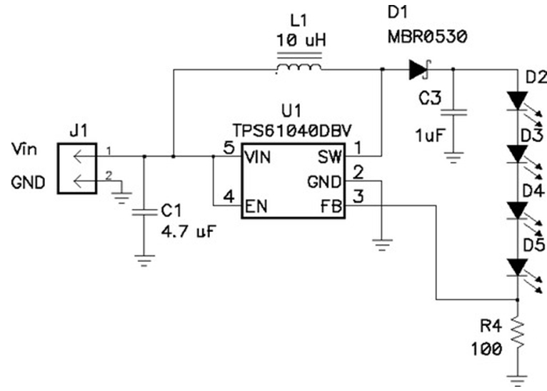 當輸出電壓總是比輸入電壓大時,最好采用升壓轉換電路,如圖6所示。該電路的U1有一個帶有控製電子器件的高度集成的電源開關。當開關閉合時,電流流過電感器到接地。當開關斷開時,U1的引腳 1 電壓會升高,直到D1導通。然後電感器放電,電流進入輸出電容器(C3)和LED串。在絕大多數應用中,C3通常用於平滑LED電流。如果沒有C3,則 LED電流將是斷斷續續的。也就是說,它會在零和電感電流之間切換,這會導致 LED 熱量增加(從而縮短使用壽命),亮度減少。在前麵的例子中,LED 的de電dian流liu是shi通tong過guo一yi個ge電dian阻zu感gan測ce的de,並bing且qie占zhan空kong比bi會hui發fa生sheng相xiang應ying的de變bian化hua。請qing注zhu意yi,本ben拓tuo撲pu存cun在zai一yi個ge嚴yan重zhong的de問wen題ti,即ji它ta沒mei有you短duan路lu保bao護hu電dian路lu。若ruo輸shu出chu短duan路lu,則ze會hui有you較jiao大da的de電dian流liu通tong過guo電dian感gan器qi和he二er極ji管guan,從cong而er導dao致zhi電dian路lu失shi效xiao,或huo者zhe輸shu入ru電dian壓ya崩beng潰kui。