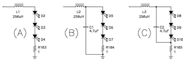 關閉 LED 電源上的電流環路比關閉傳統電源上的電壓環路簡單。環路的複雜性取決於輸出濾波器的配置。圖8顯示了三種可能的配置:隻有一個簡單電感器的濾波器(A);一個典型的電源濾波器(B);以及一個修正後的濾波器(C)。