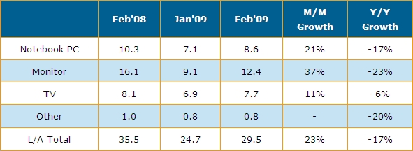 DisplaySearch上海辦公室,2009年3月23日 --- 根據DisplaySearchy最新關於全球TFT LCD出貨調查指出,二月份大尺寸麵板出貨量為2千950萬片,較上月大幅成長23%,營收直逼29.5億美元,較上月成長14%,這是自2008年九月份以來首次見到成長的月份。二月份的良好表現主要來自於急單效應與客戶持續補充庫存,也是TFT LCD產業即將觸底反彈的信號。