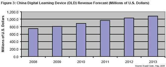 2013年DLD銷售額將從2008年時的7.494億美元上升到11億美元。在此期間,該市場的所有四個領域——電子詞典,電子學習機,兒童學習機和光學識別設備,預計都將實現增長。