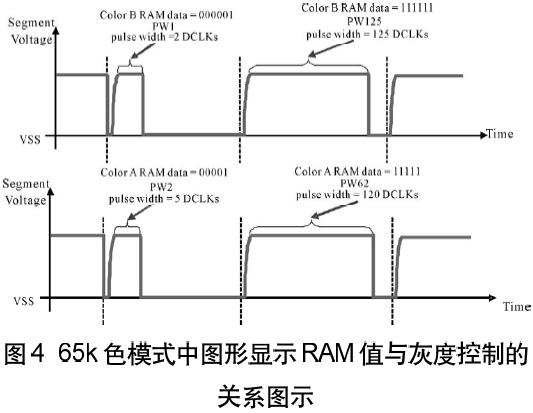 全彩顯示對每一個RGB原色分量提供6-bit,即64級灰度,通過電流驅動階段列驅動的脈寬調製(PWM)設置不同的灰度級。灰度表即為存儲了對應64級灰度(GS0~GS63)的PWM(PW0~PW63)的值。脈寬越寬,象素顯示越亮。因此,每個象素的顯示亮度由灰度表中的脈寬值決定。