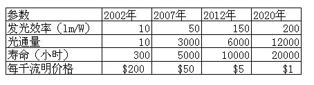 固態光源OLED目前正處在長期研發中,美國的技術進程詳情可見下表