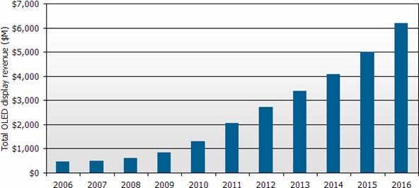 “根據DisplaySearch最新發表季度OLED(有機發光二極管顯示器)出貨報告指出,第二季全球OLED出貨金額創新高達1億9千2百萬美元,較上一季成長32%,與去年同期相比成長22%。DisplaySearch預測全球OLED產值將從2008年6億美元,按每年33%複合成長率成長,估計到了2016年整體產值將達到62億美元;其中手機主屏仍是最主要的應用,2016年出貨金額估計為30億美元,同時OLED TV產值將達20億美元,成為OLED第二大應用產品。