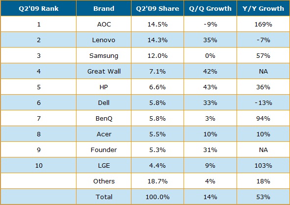 - 中國在2009年第二季以及在2009上半年成為全球液晶顯示器最大的市場