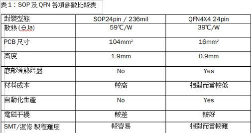 一般在使用的SOP其尺寸為104mm2(8X13x1.9mm),而QFN相對的尺寸隻有16mm2(4X4X0.9mm)隻有SOP的6~7分之一的尺寸;在做一些小間距的顯示屏設計上具有更大的彈性。