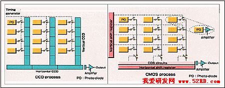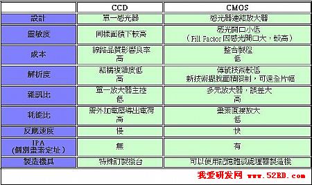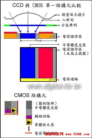 CCD與CMOS電路結構之完整比較(摘錄自SHARP月刊)差異分析整體來說,CCD與CMOS兩種設計的應用,反應在成像效果上,形成包括ISO感光度、製造成本、解析度、雜訊與耗電量等,不同類型的差異:ISO感光度差異:由於CMOS每個畫素包含了放大器與A/D轉換電路,過多的額外設備壓縮單一畫素的感光區域的表麵積,因此在相同畫素下,同樣大小之感光器尺寸,CMOS的感光度會低於CCD。