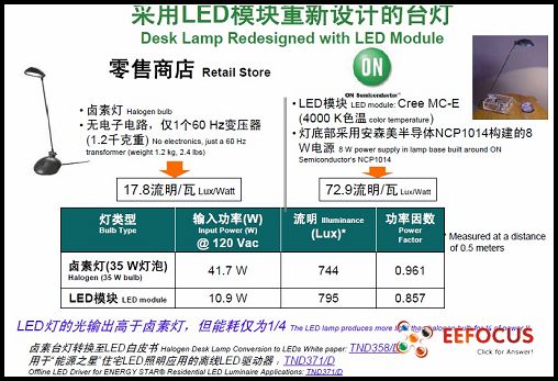 在現場,Laurent Jenck 展示了兩款從零售商店購得的鹵素台燈(采用35 W燈泡)。一款采用原鹵素燈,另外一款則采用了安森美NCP1014芯片進行穩壓改進。原鹵素燈在120 Vac條件下的輸入功率為41.7 W,在0.5米距離處測得的光亮度為744流明。采用了自供電單片式開關穩壓器的台燈在120 Vac條件下輸入功率為10.9 W,即能耗僅相當於鹵素燈的1/4;同時,這LED台燈在同等距離條件下測得的光亮度為795流明,更優於鹵素燈,其72.9流明/瓦(lm/W)的能效(efficacy)更是數倍於鹵素燈(17.8 lm/W)。