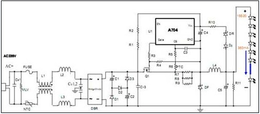 非隔離的使用的LED日光燈電源,以台灣廣鵬科技公司的A704WFT為例,A704WFT的MOS管外掛,其基本線路如圖1所示: