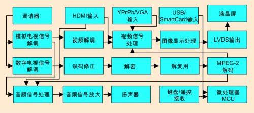 液晶高清數字電視通常由數字電視接收通道、模擬電視接收通道、音頻信號處理放大通道、視頻信號輸入處理及顯示輸出通道、微控製係統以及電源係統組成。