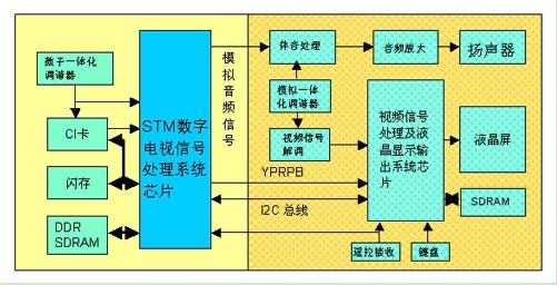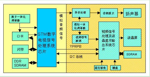 由圖2所suo示shi的de數shu字zi電dian視shi接jie收shou嵌qian入ru式shi解jie決jue方fang案an框kuang圖tu可ke看kan出chu,數shu字zi一yi體ti化hua調tiao諧xie器qi包bao括kuo數shu字zi射she頻pin頻pin率lv調tiao諧xie和he信xin道dao解jie碼ma兩liang部bu分fen,從cong接jie收shou到dao的de數shu字zi電dian視shi射she頻pin信xin號hao解jie調tiao輸shu出chu標biao準zhun的deMPEG傳輸碼流信號。未特殊加密的MPEG碼流直接輸入到ST數字電視信號解碼芯片中進行處理;對於特殊加密的MPEG碼流,首先輸入到CI卡回路進行解密,再將碼流直接輸入ST數字電視信號解碼係統芯片進行處理。經ST數字電視信號解碼係統芯片的MPEG解碼和信號編碼,AD變換輸出模擬YPRPB和立體聲音頻信號,到已有的模擬電視係統顯示數字電視圖像,從而構成完整的液晶高清數字電視。
