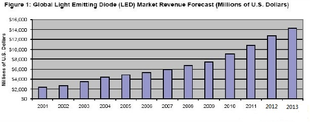 根據預測,高亮度和高通量LED 的固態照明市場在2013 年前的增長速度將高於整體LED 市場。到2013 年,標準亮度LED 傳統市場創造的營業收入將下降2.5%左右,而高亮度LED 市場將增長6.7%至54 億美元左右。高通量LED 市場將增長近53%至大約78 億美元。