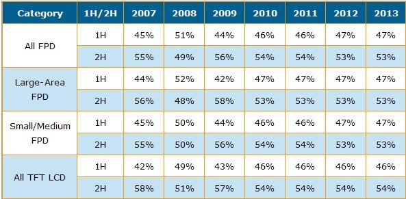 表一 2007-2013全球平麵顯示產業上下半年市場份額