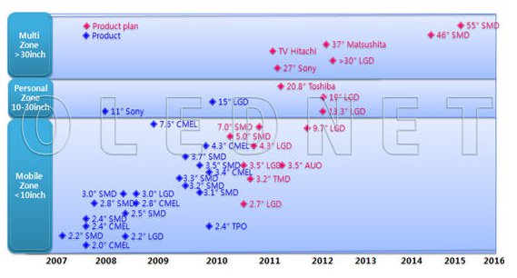 預計AMOLED行業2010年移動設備用中小型AMOLED麵板將量產。到2010年三星將有能力生產46英寸以上的OLED麵板。
