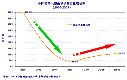 2009年,中國液晶電視市場的第一亮點就是增長速度戲劇性反彈。說增速戲劇性反彈,是因為2009年中國液晶電視的表現出乎大家預料。從2005年開始,雖然中國液晶電視市場規模一直在擴大,但增長速度卻年年縮小,2005年,中國液晶電視市場銷售規模的增速為450%,隨後基本上是每年減少一半,到2008年,增速已經下降到41%。2008年4季度,全球性經濟危機衝擊中國,所以業界對2009年中國液晶電視市場的預計基本是規模繼續擴大,增速進一步遞減,預計市場規模增速大約在20~30%之間。