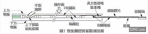 圖1是傳統阻抗式觸控麵板的斷麵結構,如圖所示,阻抗式觸控麵板是在玻璃板內側設置大小約5~10μm的隔離柱(spacer),隔離柱表麵再黏貼厚度約200μm的PET膜片(sheet),玻璃板表麵與PET膜片內側設有縱橫直交的透明阻抗電極格子ITO(IndiumTinOxide),正常狀態玻璃板表麵與PET膜片兩者被隔離柱隔離無法導通電氣。