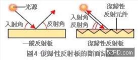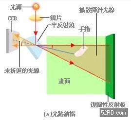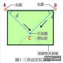 此時若在顯示器周圍設置複數個收光器,勢必會造成觸控麵板製作成本暴增,有鑑於此,研究人員在顯示器周圍黏貼「復歸性反射板(ReturnReflectorSheet)」,它ta可ke以yi反fan射she來lai自zi顯xian示shi器qi周zhou圍wei任ren何he方fang向xiang的de光guang線xian,亦yi即ji從cong感gan測ce器qi射she出chu的de任ren何he光guang線xian都dou會hui折zhe返fan至zhi感gan測ce器qi,如ru果guo被bei筆bi或huo是shi手shou指zhi遮zhe蔽bi時shi,光guang線xian就jiu不bu會hui折zhe返fan至zhi感gan測ce器qi(圖4)。